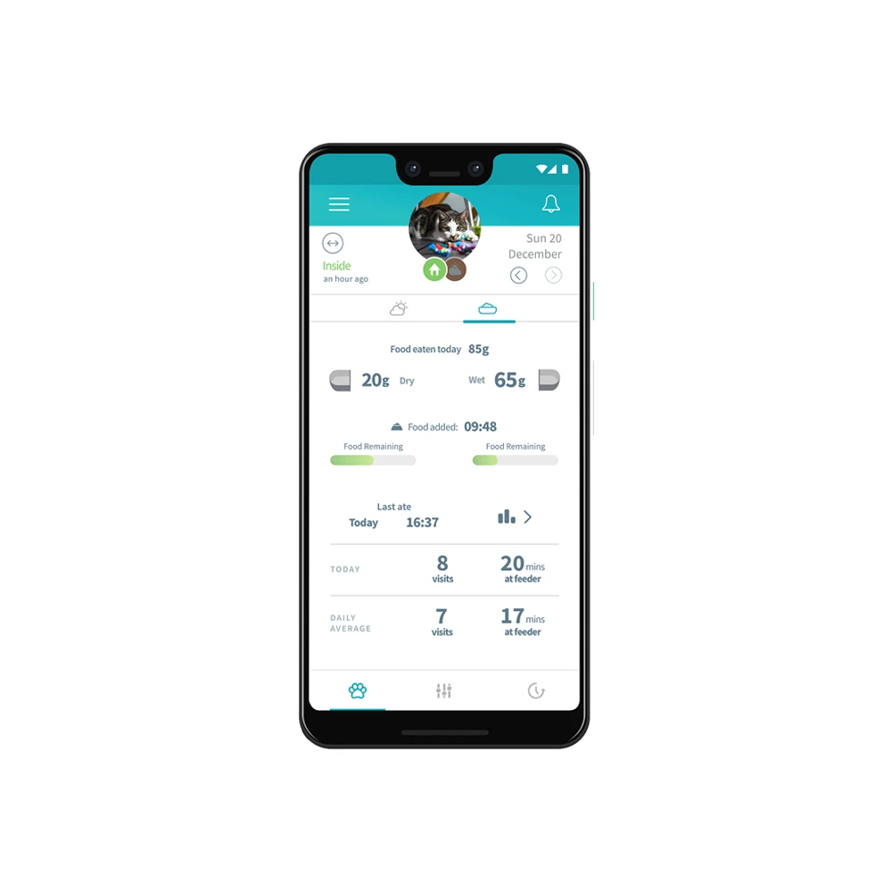 In de boog van de voerbak zit een sensor verwerkt die meteen een Microchip of een RFID-Penning detecteert. Na detectie wordt de deksel automatisch geopend. Indien uw huisdier niet gechipt is, kunt u een RFID-Penning aan de halsband van uw huisdier bevestigen. De bijbehorende app (Sure Petcare App) kunt u downloaden op uw telefoon. Wanneer u vervolgens contact maakt met het voerautomaat, kunt u in de gaten houden hoeveel en hoe vaak uw kat eet. Zo valt het snel op wanneer er een verandering in eetpatroon plaatsvindt.